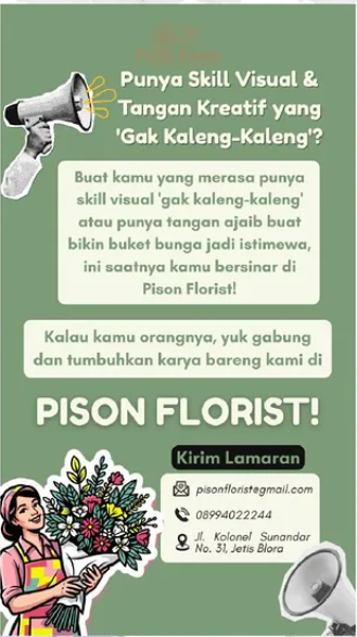 Info Loker Blora terbaru di Pison Florist. Dibuka posisi Staf Produksi (Florist) dan Foto Video Editor. Cari yang kreatif dan skill visual gak kaleng-kaleng!