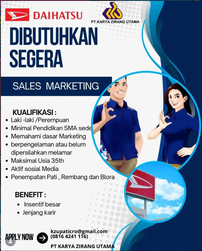 Info Loker Daihatsu terbaru penempatan Pati, Rembang, dan Blora. Posisi Sales Marketing. Syarat minimal SMA, usia maks 35 tahun. Fresh…