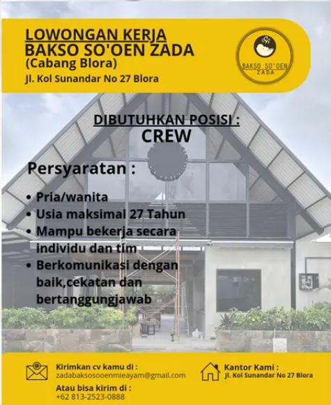 Bakso So'oen Zada Cabang Blora membuka peluang kerja bagi Anda yang energik untuk bergabung mengisi posisi CREW. Persyaratan: Lokasi Kerja:…