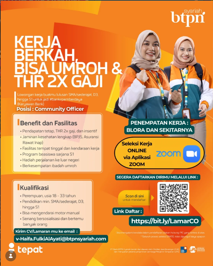 Info Lowongan Kerja BTPN Syariah Blora terbaru. Posisi Community Officer dengan benefit THR 2x gaji, mess, dan motor. Seleksi praktis…